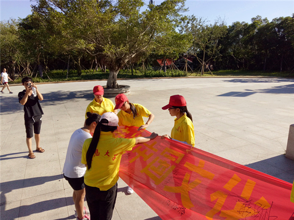 7月12日下午,今年会“魅力凤里”赴石狮市永宁古镇暑假实践队在万寿塔下进行横幅签名,以及分发调查问卷。