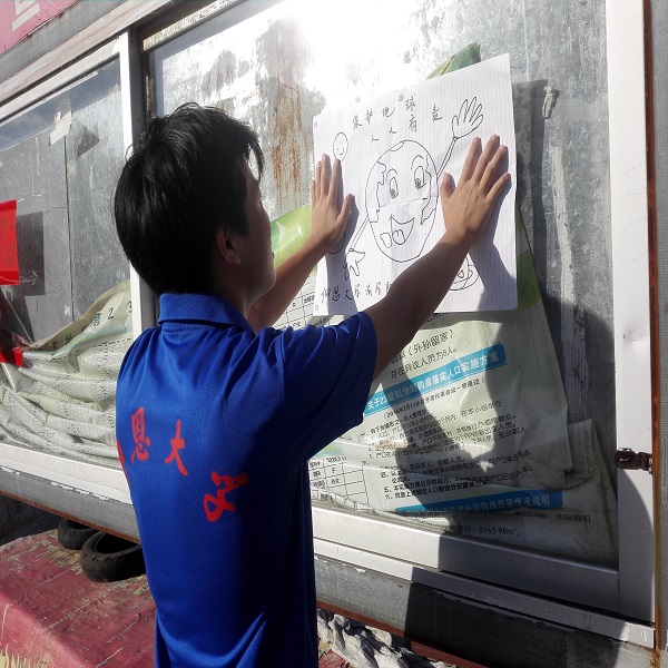 宣传环保的海报由实践队员们分组绘制而成,利用当地的环保宣传栏,向来往的行人宣传环保知识。此外,实践队还进行了签横幅活动,向过路行人宣传环保内容。当地的居民表示会在今后的日常生活中仔细注意自己的行为,践行环保。