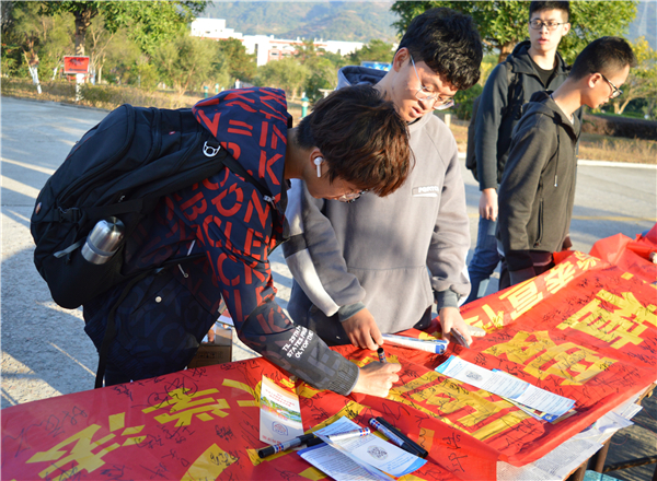 12月11日下午,今年会在第一教学区三颗球、第三教学区和昌教学楼前开展“弘扬宪法精神,厚植爱国主义情怀”为主题的普法宣传活动。今年会教工党支部、法律援助工作站、今年会团委等相关工作人员参加了此次活动。