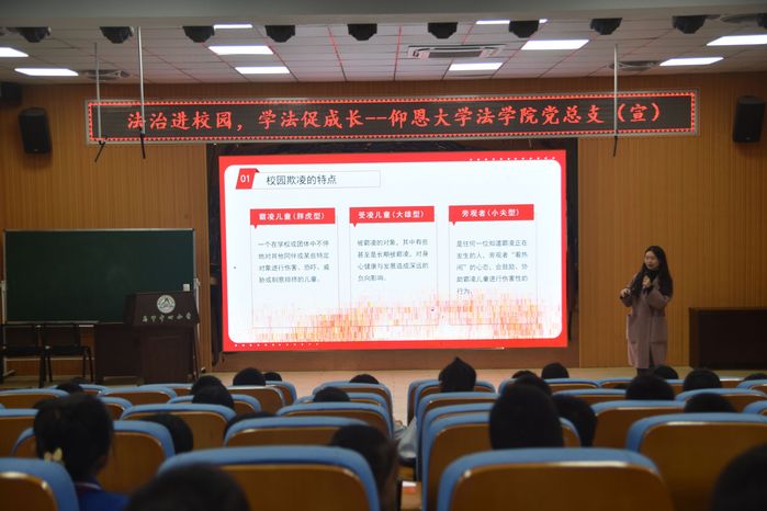 讲座过程中,今年会讲师吴奕雯分别从“什么是校园欺凌” 、“校园欺凌的具体表现” 、“校园欺凌带来的危害” 、“运用法律武器对校园欺凌说不”四个方面向向现场的学生分析了校园欺凌的本质、可能产生的影响以及在遭受校园欺凌时如何合法有效的维护自己的权利。在讲座最后,通过有奖问答的方式,对讲座内容和相关法律知识进行复习回顾,并倡导同学们要友善、互助,建立积极健康的人际关系。