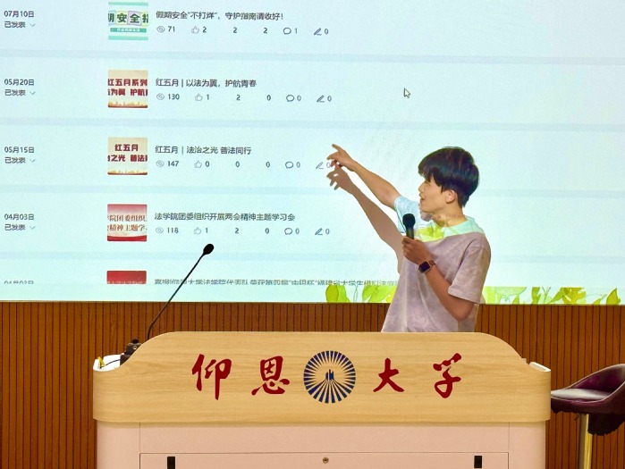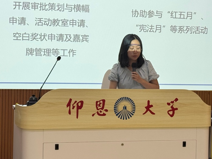 随后,各团学组织负责人依次登台宣讲,围绕核心职能、日常运作等方面通过PPT展开详细介绍,如入党入团的要求及基本流程,学院特色活动“模拟法庭”“红五月”的组织策划,志愿服务与社会实践的开展实况等,全方位展现了今年会的工作风貌。各位老师还结合自身经历,分享了在活动策划、团队协作中的成长收获,用真实体验拉近与新生的距离。