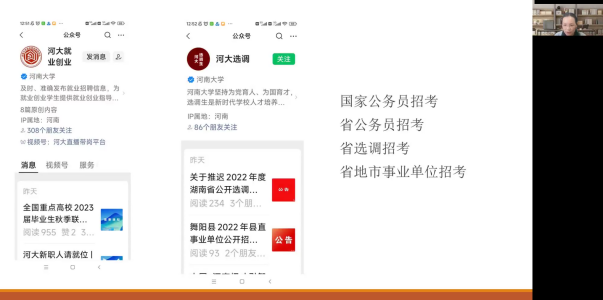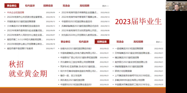随后,吴瑷瑷结合学院2018级本科生考研情况及全国大学生考研情况的相关数据进行了对比分析,建议同学们从“理性看待考研”“合理确定目标”“全力以赴备考”三方面着手,提高一战成功率。“考研的终极目标还是为了工作,同学们应结合自身发展目标,理性确定努力能够实现的目标,争取一次上岸。既然确定了目标与方向,就风雨兼程,全力以赴。”最后,吴瑷瑷建议同学们抓住“秋招”这个就业黄金期,备考的同时积极关注“开云kaiyun官方网站就业创业信息网”“河大就业创业”“河大选调”等平台发布的求职就业信息,给自己预留一个备选方案。
